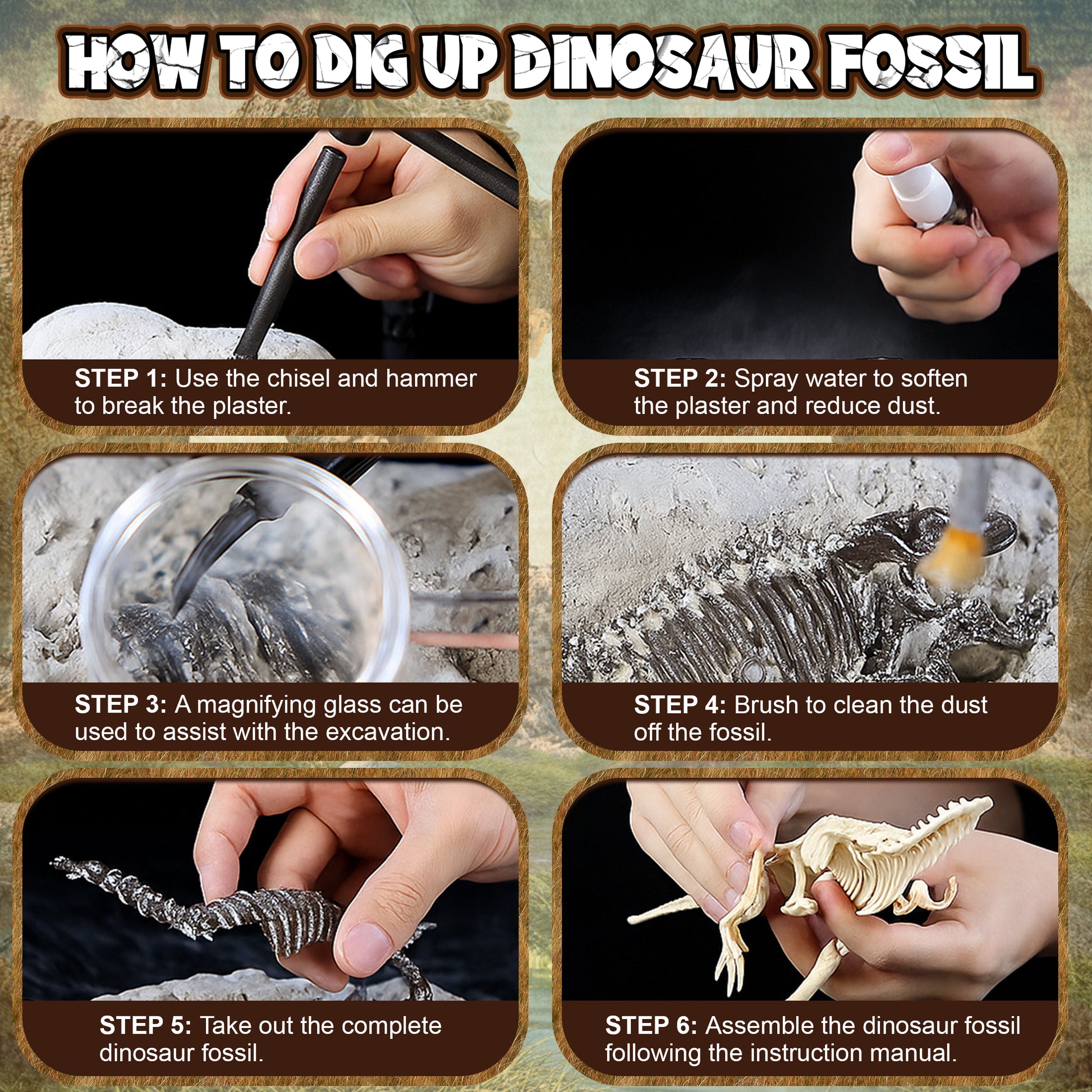 - 【Dig, Discover & Learn】Blind-box Fun! Uncover 1 of 6 prehistoric dinosaur fossils (Tyrannosaurus, Tyrannosaurus Rex, Triceratops, Sabertooth, Spinosaurus and Brachiosaurus) from a plaster block. Get a matching info card with facts! It turns play into hands-on learning—ideal for young dino fans and aspiring paleontologists.